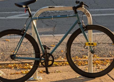 Bike was locked through front wheel and frame to the outside bike rack at the Western Orange Line station between 7:45 & 7:50 am.