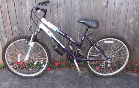 Good condition. White/blue/purple. Masking tape around part of the frame to hold a wire in place. Rip in seat. Rips in sides of handles. Gears set to 1 and 7. Picture included is similar, no waterbottle.