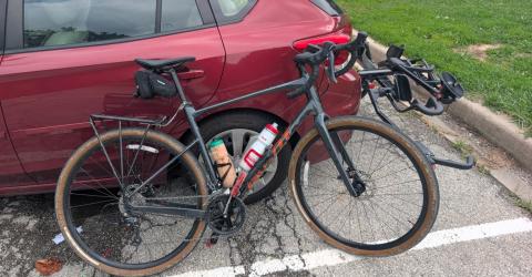 Good condition (maybe dirty), custom red pedals, gravelking tires with tan sidewalls, toppeak saddle bag, metal rack installed over rear wheel