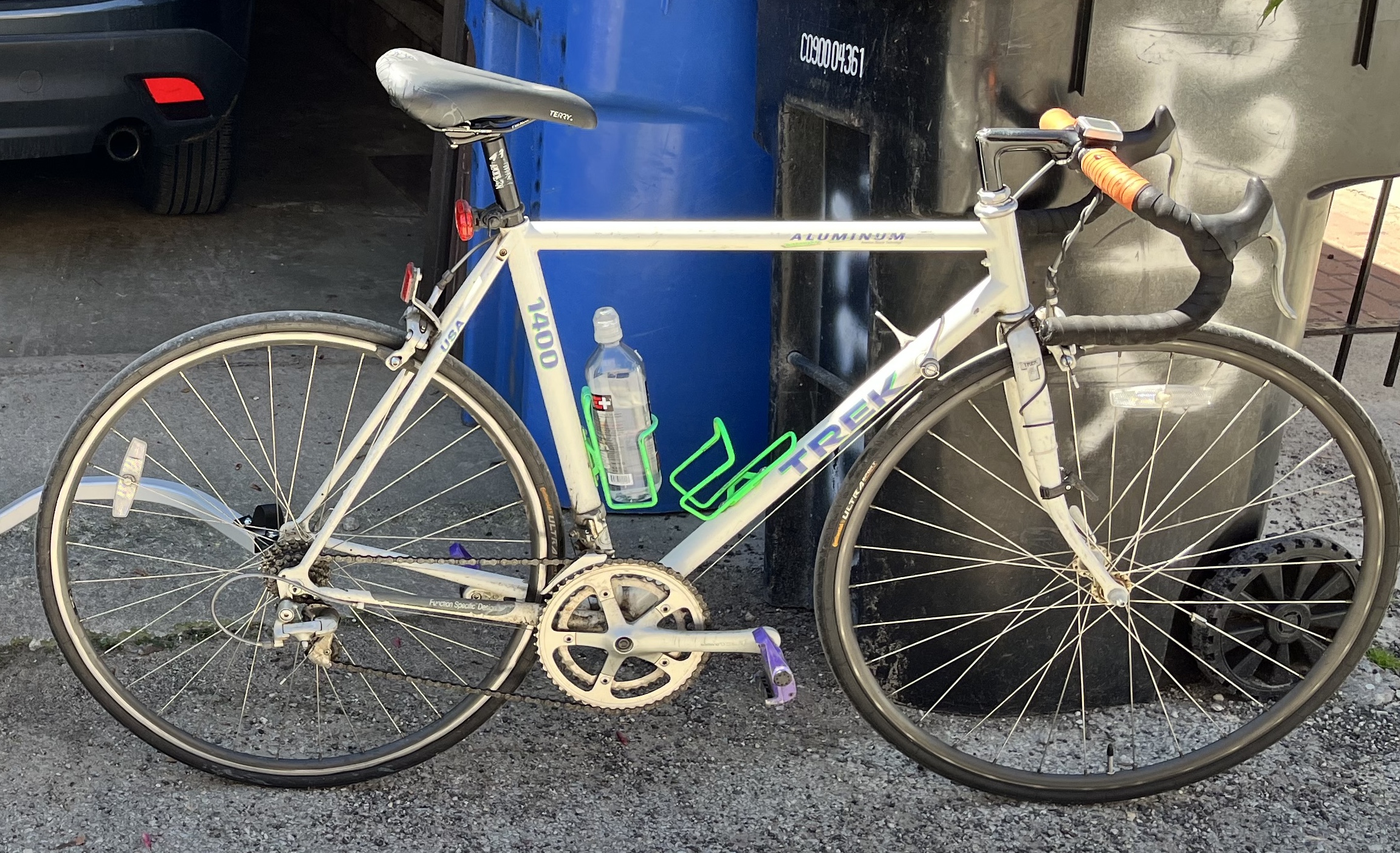 purple/green accent colors, purple clip pedals, green water bottle holders, drop handlebar with orange tape