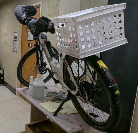 Used step through bicycle with duct tape, caution tape, a white basket on the back, handlebar gloves, a folding lock, and a green bag on the front.