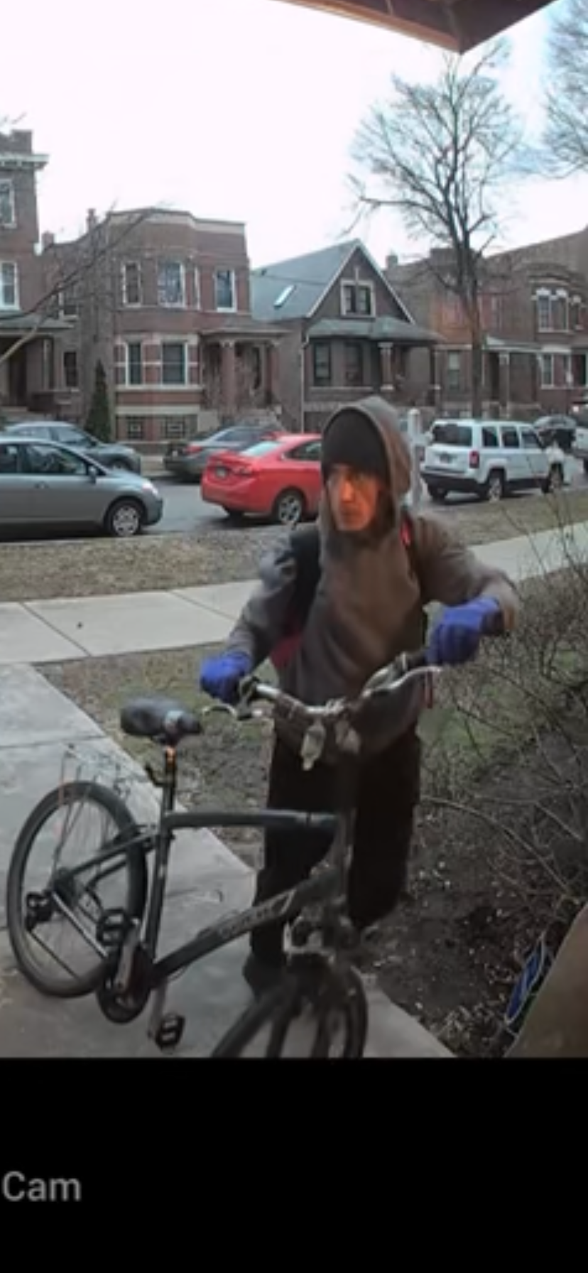 black pants, wearing a black and red backpack with a red capital A on it and a light blue zipper. He was riding an old grey bicycle in the video. I have pictures and video of this person. I came home 1 hour later and pulled the car into my secured and gated parking lot. I walk up the parking lot stairs to my back patio/porch where my family and I keep our outside equipment. There I see that my brand new 1450.00 dollar Turquiose blue Specialized bicycle has been stolen as well. The parking lot is secured by a metal 6ft tall fence, the bars seemed to have been pulled and pried open so someone could get in. I don’t know how the person was able to get my bicycle over the metal fence. Again, I have a video of the possible offender and the package theft.