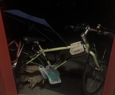 My bike is a light yellowish-green Jamis Coda Sport. The bike is a little dirty but all functions are fine. There are two folding baskets and a thick red elastic rope on the back Rock of the bicycle. There is a small white bag on the frame of the bike and there is a bell with a jerry doll of Tom and Jerry on the handlebars.